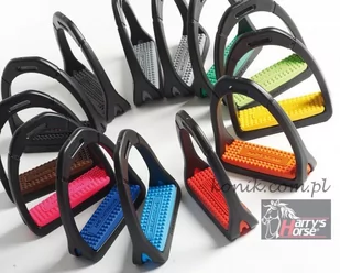 Syntetyczne strzemiona firmy Compositi. Dzięki zastosowaniu nowoczesnych materiałów są wytrzymałe, lekkie i eleganckie. Nowoczesny design i możliwość wyboru kolorów pozwoli na bycie modnym i trendy. Do strzemion można również dokupić dodatkowe kolorowe wkładki oraz koszyczki. Kolor strzemion: