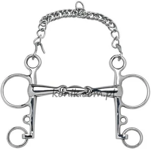 Pelham podwójnie łamany, pusty. Anatomicznie dopasowany kształt ścięgierza, przyjemniejszy dla końskiego pyska.W komplecie łańcuszek i haczyki.Wykonany ze stali nierdzewnej.Grubość ścięgierza: 21mmDługość czanek: 110mm...