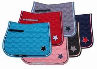 Czaprak pikowany w gwiazdki, ozdobiony w rogu naszywaną gwiazdką. Materiał wykonany ze sztucznej bawełny. Od strony wewnętrznej materiał typu wafel dobrze absorbujący wilgoć. Wykończony dwoma szureczkami ozdobnymi w różnych kolorach. Kolor: frost grey - szaryhollywood star - czerwonyice blue - niebieskinavy star - granatowyroyal black - czarnyvirtual pink - różowy.