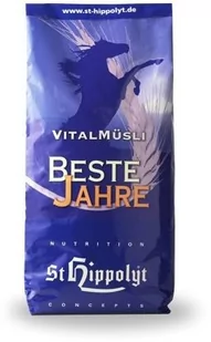 Zawarte w Beste Jahre składniki odżywcze zapewniają witalność i zdrowie każdego seniora w stajni!Strategia żywienia "anti-aging"Beste Jahre Vitalmüsli stanowi idealne uzupełnienie codziennej diety starszych koni. Receptura mieszanki oparta o podwyższoną zawartość naturalnych przeciwutleniaczy oraz kliniczną dawka minerałów pochodzenia organicznego, stanowi doskonałe źródło bioaktywnych substancji o charakterze przeciwstarzeniowym. Wartościowe oleje roślinne, kiełki zbóż oraz starannie dobrane zioła usprawniają regenerację narządów i tkanek oraz korzystnie wpływają na poprawę procesów trawiennych u koni starszych. Musli polecane dla koni starszychmających problemy w utrzymaniu stałej masy ciałamających problemy z zębami (trudności w pobieraniu i przeżuwaniu paszy)podatnych na schorzenia przewodu pokarmowego (biegunki, zaparcia, kolki)źle wykorzystujących paszę (zaburzenia wchłaniania substancji odżywczych)podatnych na ochwat, chorobę Cushinganiechętnie pobierających paszę (spadek apetytu)w celu opóźnienia procesu starzenia sięSkład: płatki jęczmienne, siekane siano St.
