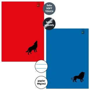 Zeszyt A4/32K linia 90g Wilk Lew (6szt). Zeszyt. Opakowanie zbiorcze mix wzorów 6sztZeszyt formatu A4 okładka folia soft touchlakier wybiórczy32 kartki, papier 90gm2kolorowe wzornictwo i w zależności od modelu zdobienie przy pomocy lakieru wybiórczegokolory przedstawione na zdjęciu mogą nie