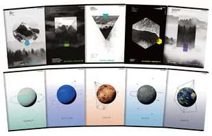 Kolekcja zeszytów inspirowana badaniem kosmosu i tęsknotą za naturą - łączy w sobie 2 zupełnie różne style ilustracji. 5 okładek przedstawia planety i księżyc w bardzo prostym, symbolicznym ujęciu. Kolejne 5 to widoki na naturę pokazane w sposób abstrakcyjny, geometryczny, w. . .