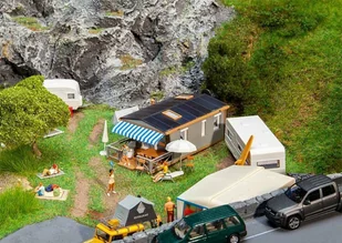 Architektura mobilna! Przenośna jednostka mieszkalna z werandą, markizą i dwuspadowym dachem ze świetlikami do ustawienia pola namiotowego. Pasujące akcesoria, np B. parasole, leżaki i stół z krzesłami ogrodowymi są dołączone do modelu.