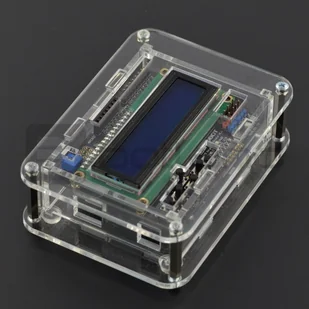 Przezroczysta obudowa chroniącą moduł Arduino Uno z modułem LCD Keypad Shield. Zapewnia dostęp do złącz: USB i zasilającego Arduino oraz przycisków znajdujących się na nakładce.