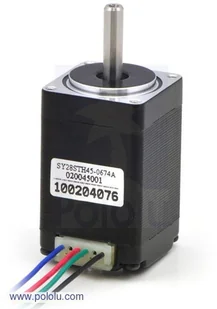 Bipolarny silnik krokowy posiada rozdzielczość 200 kroków na obrót, czyli pełny krok odbywa się co 1,8 °. Pobór prądu to 670 mA na cewkę przy napięciu zasilania 4,5 V. Moment trzymający wynosi 0,95 kg*cm (0,095 Nm). Na wyjściu znajduje się wał o średnicy 5 mm.