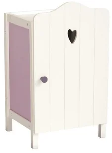 - Dziecięcy mebel dla lalek ma piękne, lakierowane na biało drzwi z sercem. Podział szafki obejmuje drążek na ubrania i półkę na akcesoria dla lalek.