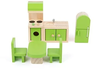 Wykonany jest z litego drewna zapewniającego trwałość. Główne cechy: ten zestaw pobudza wyobraźnię i ćwiczy zdolności motoryczne podczas zabawy Domek dla lalek meble kuchnia od 3 lat Szafka kuchenna ok. 12 x 5 x 12 cm, lodówka ok. 4 x 4 x 9 cm UWAGA: