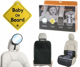 Lustro można również regulować, aby uzyskać optymalną widoczność. Wykonane jest z superodblaskowego plastiku. Przeznaczone do prawie wszystkich samochodów: lustro wymaga osobnych zagłówków w samochodzie. 4. Tabliczka/znak ,,Baby on board", który można łatwo przymocować do okna za pomocą przyssawki.