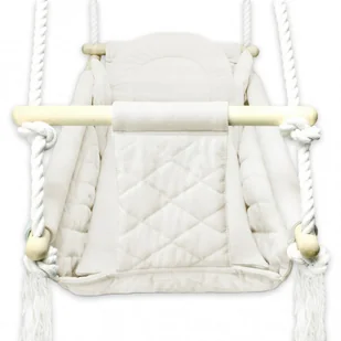 Huśtawka ze stelażem z drewna bukowego. Bawełniane liny (możliwość regulacji wysokości huśtawki). Metalowe obręcze do podwieszania. Siedzisko wyposażone we wkładkę z antyalergicznego wypełnienia. Produkt robiony ręcznie w Polsce.