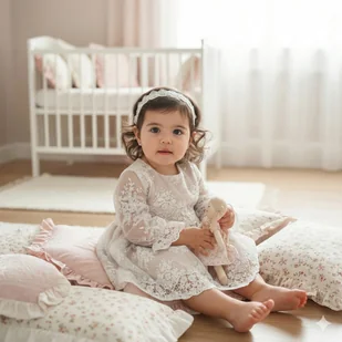 Sukienka do chrztu Anna w delikatnym kolorze beżu i złamanej bieli. Uszyta na bawełnianej podszewce. Tył zapinany na kryty zamek oraz długie rękawki zakończone falbanką. Spódnica składa się z kilku warstw: - ...