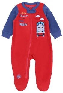 Śpioszki, piżama niemowlęca, w niebiesko-czerwonym kolorze, na długi rękaw. Z przodu wizerunek Tomka, z bajki "Tomek i Przyjaciele". Na całej długości zapięcie na zamek. Zabudowane stopki, rękawy wykończone ściągaczem. Wykonane z miękkiego, polarowego oraz miłego w dotyku materiału.