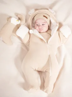 Pajac ocieplany wykonany z zewnątrz z beżowej bawełny dresowej. Podszyty delikatnym futerkiem w kolorze kremowym, co sprawia, że ubranko idealnie nadaje się na chłodne dni. Całość zdobi kaptur z uszkami. Ubranko posiada zawijane rękawy aby na dworze ochronić rączki dziecka przed zimnem. Materiał jest całkowicie bezpieczny dla skóry dziecka.