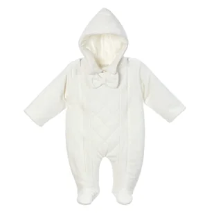 Welurowy pajac z kapturem dla chłopca w kolorze ecru, delikatnie ocieplany. Ozdobna pikowana kratka i duża mucha. Zapinanie na suwak na całej długości. 100% miękkiego weluru bawełnianego. Ocieplina: antyalergiczne włókna typu Hollow nieabsorbujące odoru i wilgoci.
