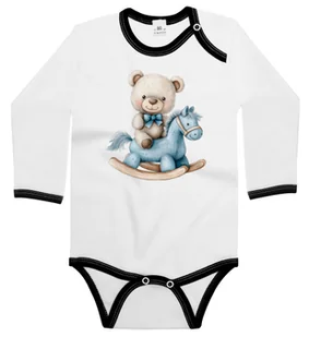 💙 Body dziecięce z długim rękawem z nadrukiem Pluszowy Misio Na Niebieskim Koniku Na Biegunach Biało-Czarne 98/104 nr wzoru: nr wzoru: 121712135132 👶 Twoje dziecko zasługuje na wszystko, co najlepsze — a nasze bawełniane body z nadrukiem to gwarancja wygody, bezpieczeństwa i… odrobiny magii dzieciństwa! 🐉✨