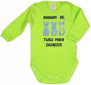 BODY DŁUGI RĘKAW z napisami w rozmiarze 74, od producenta. WZÓR: TWÓJ MAŁY ZAJĄCZEK (trzy zajączki mienią się kolorami i są gładkie w dotyku. Zdjęcie nie oddaje w pełni uroku zdobienia). Body w kolorze jasnej zieleni. Producent: KLEKLE Kraj pochodzenia: Polska Stan: