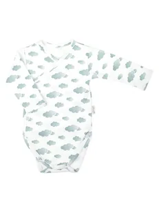 Wyprodukowano w Polsce Kopertowe body z długim rękawem dla chłopca, uszyte z 100% bawełny drukowanej w lodowe chmurki. Produkt jest zapinany z przodu i w kroku na bezniklowe napy. Model ten polecany jest dla noworodków, ponieważ zastosowane zapięcie kopertowe ułatwia ubieranie dziecka. Materiał posiada certyfikat Oeko-Tex Standard 100 Tekstylia godne zaufania.