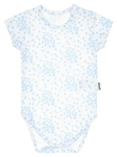 Body kopertowe z krótkim rękawem dla dziewczynki, uszyte z białej bawełny w niebieskie kwiatuszki. Materiał posiada certyfikat Oeko-Tex Standard 100 Tekstylia godne zaufania. Model ten polecany jest dla noworodków, ponieważ zastosowane zapięcie ułatwia ubieranie dziecka. Zapinane na bezniklowe napy z przodu oraz w kroku.