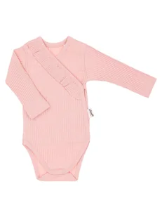 Body kopertowe z długim rękawem dla dziewczynki, uszyte z prążkowanego materiału w kolorze pudrowego różu, zdobione falbanką z przodu. Zapinane na bezniklowe napy z przodu oraz w kroku. Model ten polecany jest dla noworodków, ponieważ zastosowane zapięcie kopertowe ułatwia ubieranie dziecka. Materiał całkowicie bezpieczny dla dziecka.