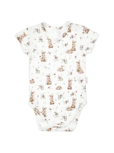 Wyprodukowano w Polsce Body z krótkim rękawem dla dziewczynki. Zdecydowanie must have każdego rodzica. Uszyte z drukowanej bawełny. Druk przedstawia zajączki w odcieniach brązu pośród delikatnej łąki. Posiada certyfikat Oeko-Tex Standard 100 Tekstylia godne zaufania.