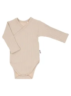 Body z długim rękawem, uszyte z beżowej prążkowanej bawełny z niewielką ilością elastanu. Materiał posiada certyfikat Oeko-Tex Standard 100 Tekstylia godne zaufania. Body zapinane kopertowo na bezniklowe napy oraz w kroku, co ułatwia przebieranie.