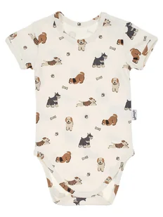 Wygodne body z krótkim rękawem dla chłopca, idealne w ciepłe dni. Uszyte z kremowej bawełny w motyw piesków. Materiał całkowicie bezpieczny dla maluszka. Produkt zapinany na ramieniu i w kroku na bezniklowe napy. Ułatwi to znacznie przewijanie dziecka.