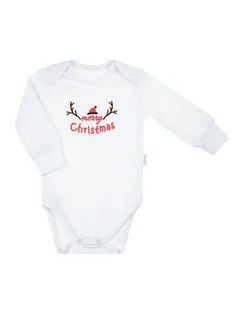 Bożonarodzeniowe body niemowlęce z haftem Uszyte z wysokiej jakości bawełny (100%), posiadającej certyfikat Oeko-Tex Standard 100. Rękawy zakończone ściągaczem dla większego komfortu. Ramionka na zakładkę ułatwiają przebieranie maluszka. Body zapinane w kroku na bezniklowe napy, które są delikatne dla skóry. Ozdobione świątecznym haftem "Merry Christmas", wzbogaconym rogami renifera i świąteczną czapką.