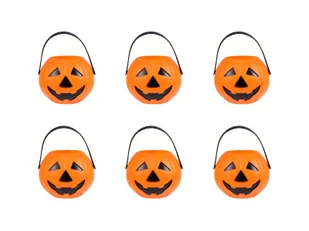 Plastikowe wiaderko Dynia na cukierki lub jako dekoracja na halloween. Średnica: 7 cm. Opakowanie: 6 szt.