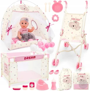 LALKA WÓZEK ŁÓŻECZKO ZESTAW PREZENT AKCESORIA 5w1 BUTELKA DLA DZIECI NAMIOT