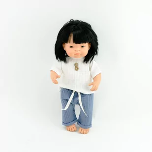Zestaw ubranek uszytych specjalnie dla hiszpańskich lalek Miniland. Wysokość lalki 38 cm. Dwuelementowy zestaw składający się z: z muślinowej bluzeczki w kolorze ecru, pod szyją rozciągliwa gumka, polecane nawet dla najmłodszych spodenek uszytych z muślinu w kolorze niebieskim Całość zapakowana w papierową eko torebkę.