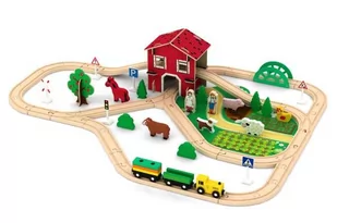 W zestawie: 77 elementów, tory, lokomotywa, 2 wagoniki, zwierzątka, drzewka, postacie, mata, akcesoria. Wymiary opakowania: 40,5 x 29 x 6,5 cm. Wiek 3+.