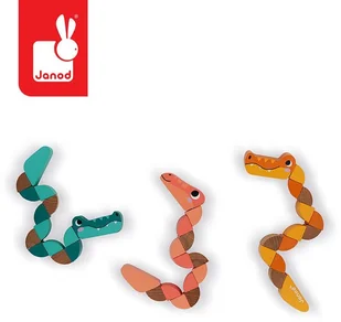 Drewniana układanka do wyginania Wąż lub Krokodyl to niebanalna, kieszonkowa zabawka, która stymuluje małą motorykę, koordynację ręka-oko, zmysł dotyku, koncentrację i dostrzeganie związków przyczynowo-skutkowych. Serpentyna składa się z 14 elementów na mocnej gumce - głowy, ogona i 12 zaokrąglonych trójkątów, tworzących ciało stworzenia. Dziecko może wszystkie części wyginać, obracać i układać w dowolnej względem siebie pozycji, zmieniając kształt serpentyny, co wymaga skupienia, kreatywności i ostrożności.