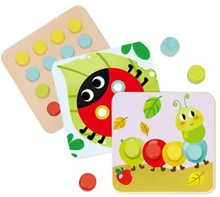 Drewniane Kolorowe Klocki od Tooky Toy dla dzieci od 12 miesiąca życia to idealne rozwiązanie do domu, jak i do przedszkola. Składa się z planszy na której jest 16 kolorowych klocuszków, oraz 6 plansz ze zwierzątkami. Do każdej planszy trzeba odpowiednio dopasować element tak by powstał cały obrazek. Na drewnianej podstawce znajdują się wgłębienia, które swoim kształtem odpowiadająkolorowym puzzlom. Dzięki zabawce dziecko rozwija koordynację wzrokowo-ruchową.