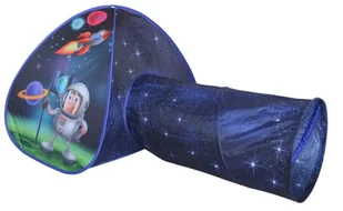 Kolorowy namiot z tunelem z motywem kosmonauty dla aktywnych dzieci. Możesz korzystać z namiotu w domu - w pokoju, ale także w ogrodzie na zewnątrz latem. Dzieci świetnie się bawią, grając i ukrywając się w tym cudownym namiocie.