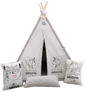 Poszycie to kolejna kluczowa kwestia każdego namiotu. My postawiliśmy na "królową wszystkich tkanin" i ścianki wigwamu uszyliśmy ze 100% bawełny Magic 3XT marki Elior. Bawełna to naturalny materiał, który nie uczuli Twojego dziecka, zapewni przewiewność konstrukcji i będzie miły w dotyku. To idealny materiał na namiot. Ale to nie wszystko. By nie wkradła się nuda tipi ozdobiliśmy kolorowymi dziecięcymi obrazkami. Twój maluch może wybierać spośród 5 uroczych wzorów (księżniczki, batmana, łabędzia, jednorożca i liska). A jak po trudach pasjonującej zabawy Twoje dziecko zapragnie odpocząć będzie mogło położyć się na mięciutkich poduszkach (wypełnionych kulkami silikonowymi, które są hipoalergiczne i doskonale dopasowują się do ciężaru główki dziecka) i pikowanej macie, którą z kolei uszyliśmy z wysokiej klasy materiału pluszowego River 7XT marki Elior. Jest to tkanina typu velvet, która wyróżnia się lekkością, odpornością na uszkodzenia i nieziemską delikatnością.