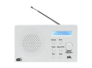 Radio OK. ORD 101Bt-Wt-3 DAB Biały OK. ORD 101Bt‑Wt‑3 to przenośne radio Fm/Dab+ wyposażone w antenę teleskopową, moduł Bluetooth 4. 2 oraz podświetlany wyświetlacz Led. Urządzenie umożliwia odbiór cyfrowych i analogowych stacji radiowych, odtwarzanie muzyki bezprzewodowo oraz korzystanie z funkcji zegara, budzika i drzemki. Konstrukcja z tworzywa sztucznego i złącza 3,5 mm oraz DC 5V zapewniają wygodę użytkowania w domu i poza nim.