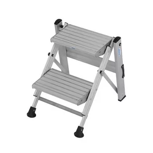 Wytrzymałe, aluminiowe składane schodki z dużymi ryflowanymi stopniami zapewniającymi wygodną i bezpieczną postawę w czasie pracy. Szczegóły: Antypoślizgowa powierzchnia wszystkich stopni z okładziną z tworzywa sztucznego o wymiarach 230x370 mm