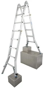 >> Więcej informacji KRAUSE Stabilo przegubowa drabina teleskopowa z 4 regulowanymi nogami 4x5 szczebli Profesjonalna, przegubowa drabina teleskopowa marki KRAUSE serii STABILO (VIDEO) jest prawdziwym multitalentem. Sprawdza się zarówno jako drabina przystawna, drabina wolnostojąca, lub jako podest roboczy. Bardzo praktyczna funkcja regulacji długości podłużnic (ClicMatic) umożliwia ustawienie drabiny na różnych nierównościach podłoża np. na schodach. Wzmocnione krawędzie podłużnic dodatkowo stabilizują drabinę oraz zwiększają jej wytrzymałość.