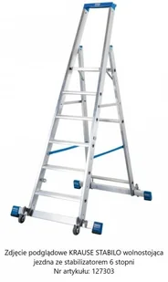 KRAUSE STABILO drabina wolnostojąca jezdna ze stabilizatorem 7 stopni Aluminiowa drabina STABILO firmy KRAUSE przeznaczona do użytku profesjonalnego. Wyposażona jest w dwa stabilizatory z samoblokującymi się rolkami jezdnymi, co zapewnia bardzo stabilną pozycję przy pracy.