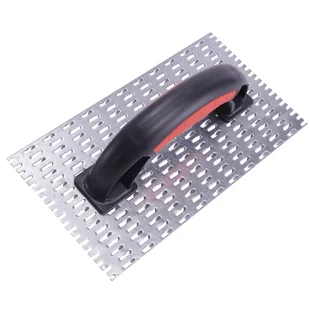 Oryginalny metalowy zdzierak do tynków marki COMENSAL. Wykonany z niedzewnej ocynkowanej dziurkowanej blachy z ostrymi zębami. Ergonomiczny uchwyt z wyprofilowanymi na palce wgłębieniami dobrze układa się w dłoni, daje poczucie wygody i „panowania” nad narzędziem. Umieszczone po bokach gumki antypoślizgowe dodatkowo stabilizują dłoń.