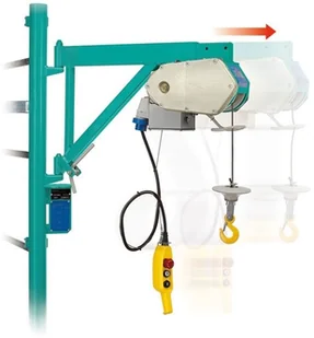 Wciągarka budowlana przystosowana jest do pracy na napięciu 210 - 235 V, bez wpływu na udźwig. Bęben na linę umieszczony poprzecznie względem, nie zawsze wypoziomowanej ramy, zapobiega nawijaniu się liny na jednym boku. Należy jednak pamiętać o blokadzie pozycji ramy, tak aby podczas wciągania np. lekkich i wielkogabarytowych materiałów, silny wiatr nie miał wpływy na ich przemieszczanie. Dodatkowym atutem tego modelu jest przedłużany wysięgnik z 72 - 112 cm i lina długości 41m.