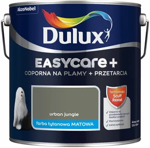 Dulux Emulsja EasyCare + urban jungle 2,5L Emulsja EasyCare + Odporna na Plamy + Przetarcia marki Dulux. Jest nowoczesną farbą lateksową o właściwościach tytanowych, która wyróżnia się wysoką wytrzymałością mechaniczną. Jej formuła tworzy trwałą powłokę, odporną na powstawanie przetarć i śladów po uderzeniach lub zarysowaniach przedmiotami z plastiku, drewna lub gumy. Może to być np. odkurzacz, krzesło, podeszwa od butów.