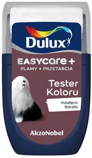 Dulux Tester EasyCare + modern bordo 30 ml Emulsja EasyCare + Odporna na Plamy + Przetarcia marki Dulux. Jest nowoczesną farbą lateksową o właściwościach tytanowych, która wyróżnia się wysoką wytrzymałością mechaniczną. Jej formuła tworzy trwałą powłokę, odporną na powstawanie przetarć i śladów po uderzeniach lub zarysowaniach przedmiotami z plastiku, drewna lub gumy. Może to być np. odkurzacz, krzesło, podeszwa od butów.