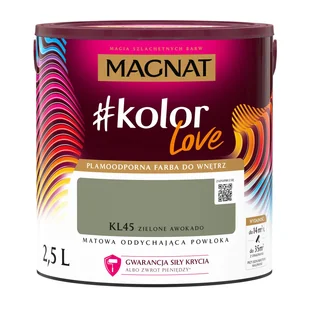Farba Magnat KolorLove zielone awokado 2,5l MAGNAT #kolorLove to matowa farba do wnętrz przeznaczona do malowania ścian i sufitów. Plamoodporna, matowa powłoka Farby do wnętrz z serii #kolorLove tworzą wysokiej jakości lateksową, paroprzepuszczalną powłokę, odporną na plamy oraz wielokrotne zmywanie i szorowanie oraz umożliwiającą oddychanie ścian. Doskonała siła krycia oraz unikalna technologia Kolor Ultra HD wydobywająca wyjątkową głębię koloru zapewniają rewelacyjny efekt eleganckiej, matowej powierzchni, która będzie wyglądać świeżo i pięknie przez długi czas. Zakres zastosowania Farba emulsyjna Magnat przeznaczona jest do dekoracyjno-ochronnego malowania ścian i sufitów z zapraw cementowych, cementowo-wapiennych, gipsowych, cegły, płyt gipsowo-kartonowych, drewnianych, drewnopochodnych oraz tapet, również tych z włókna szklanego użytkowanych wewnątrz pomieszczeń. Produkt osiąga wydajność do 14m2 /l przy jednokrotnym malowaniu.