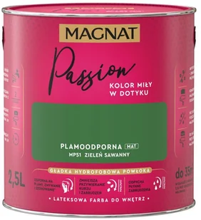 MAGNAT Passion to farba lateksowa o plamoodpornych i hydrofobowych właściwościach. Gładka i matowa powłoka farby podkreśla głębię koloru i sprawia, że pomalowane ściany są wyjątkowo miłe w dotyku. Farba przeznaczona jest do dekoracyjnoochronnego malowania ścian i sufitów z zapraw cementowych, cementowowapiennych, gipsowych, cegły, płyt gipsowokartonowych, drewnianych, drewnopochodnych oraz tapet, również tych z włókna szklanego użytkowanych wewnątrz pomieszczeń.