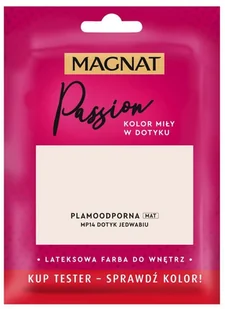 MAGNAT Passion TESTER - to próbka oryginalnej farby, dzięki której można w łatwy sposób dobrać i sprawdzić kolor. Magnat Passion to farba lateksowa o plamoodpornych i hydrofobowych właściwościach. Gładka i matowa powłoka farby podkreśla głębię koloru i sprawia, że pomalowane ściany są wyjątkowo miłe w dotyku. Farba przeznaczona jest do dekoracyjnoochronnego malowania ścian i sufitów z zapraw cementowych, cementowowapiennych, gipsowych, cegły, płyt gipsowokartonowych, drewnianych, drewnopochodnych oraz tapet, również tych z włókna szklanego użytkowanych wewnątrz pomieszczeń.