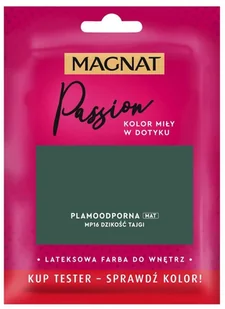MAGNAT Passion TESTER - to próbka oryginalnej farby, dzięki której można w łatwy sposób dobrać i sprawdzić kolor. Magnat Passion to farba lateksowa o plamoodpornych i hydrofobowych właściwościach. Gładka i matowa powłoka farby podkreśla głębię koloru i sprawia, że pomalowane ściany są wyjątkowo miłe w dotyku. Farba przeznaczona jest do dekoracyjnoochronnego malowania ścian i sufitów z zapraw cementowych, cementowowapiennych, gipsowych, cegły, płyt gipsowokartonowych, drewnianych, drewnopochodnych oraz tapet, również tych z włókna szklanego użytkowanych wewnątrz pomieszczeń.