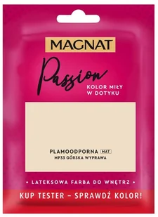 MAGNAT Passion TESTER - to próbka oryginalnej farby, dzięki której można w łatwy sposób dobrać i sprawdzić kolor. Magnat Passion to farba lateksowa o plamoodpornych i hydrofobowych właściwościach. Gładka i matowa powłoka farby podkreśla głębię koloru i sprawia, że pomalowane ściany są wyjątkowo miłe w dotyku. Farba przeznaczona jest do dekoracyjnoochronnego malowania ścian i sufitów z zapraw cementowych, cementowowapiennych, gipsowych, cegły, płyt gipsowokartonowych, drewnianych, drewnopochodnych oraz tapet, również tych z włókna szklanego użytkowanych wewnątrz pomieszczeń.