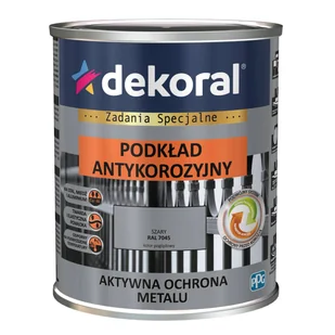 Dekoral Podkład antykorozyjny szary 0,9L Super wydajny, szybkoschnący podkład antykorozyjny przeznaczony jest do malowania konstrukcji stalowych, powierzchni stalowych, żeliwnych oraz elementów miedzianych i aluminiowych jako podkład pod wyroby nawierzchniowe (emalie ftalowe, emalie ftalowe modyfikowane, emalie chlorokauczukowe), wewnątrz i na zewnątrz pomieszczeń. Może być stosowany do czasowej ochrony przed korozją na czas transportu i składowania. Powłoka podkładu charakteryzuje się matowym wykończeniem oraz posiada dobre właściwości antykorozyjne i odporność mechaniczną. Powstała powłoka ma dużą twardość i elastyczność, a także odporność na uderzenia oraz na podwyższone temperatury: do ꡜst. C. Dwufunkcyjny system ochrony przed korozją: