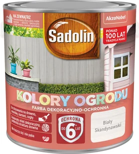 Kolory ogrodu Biała skandynawia 2,5 l, firmy Sadolin. Jest to farba dekoracyjno-ochronna została stworzona po to, aby w łatwy sposób nadawać drewnu piękne kolory, jednocześnie chroniąc je przed czynnikami atmosferycznymi. Produkt może być aplikowany także na pionowe elementy dekoracyjne wykonane z kamienia, cegły oraz ceramiki ogrodowej. Wodorozcieńczalna formuła pozwala na łatwą aplikację dzięki niskiemu poziomowi zapachu oraz szybkiemu czasowi schnięcia. Aplikacja tylko przy użyciu pędzla.
