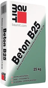 Baumit Beton B25 to fabrycznie przygotowana sucha zaprawa betonowa klasy C20/25. Stosowana przy wykonywaniu drobnych robót betoniarskich i naprawczych (np. murków, daszków, czap, itp.), innych elementów małej architektury oraz do wykonywania podkładów betonowych i posadzek w pomieszczeniach technicznych, piwnicach, garażach, itp. Do stosowania wewnštrz i na zewnštrz.